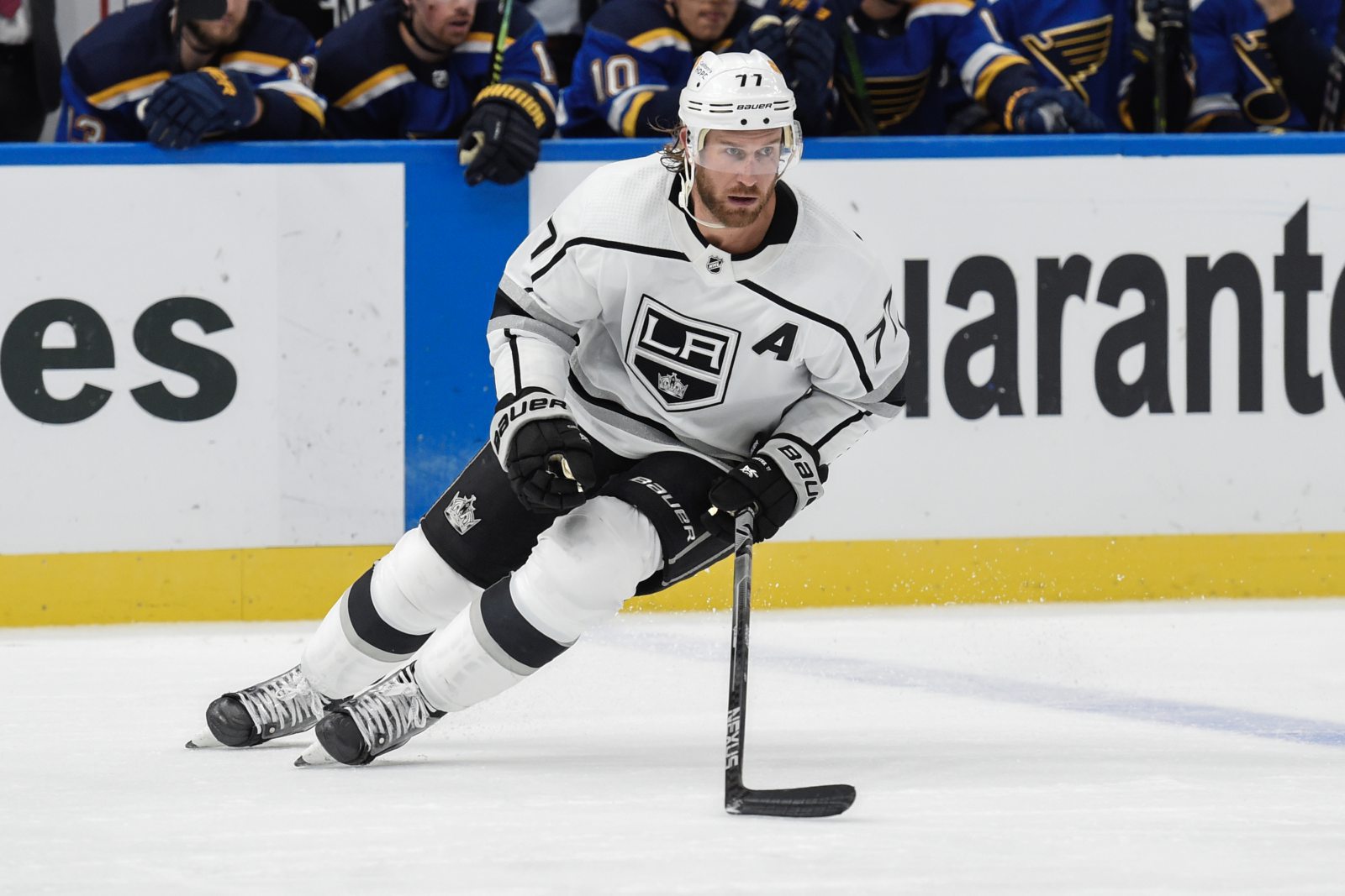Los Angeles Kings’ Jeff Carter (77) in action against the St. Louis Blues during the third period of an NHL hockey game Sunday, Jan. 24, 2021, in St. Louis. (AP Photo/Joe Puetz)