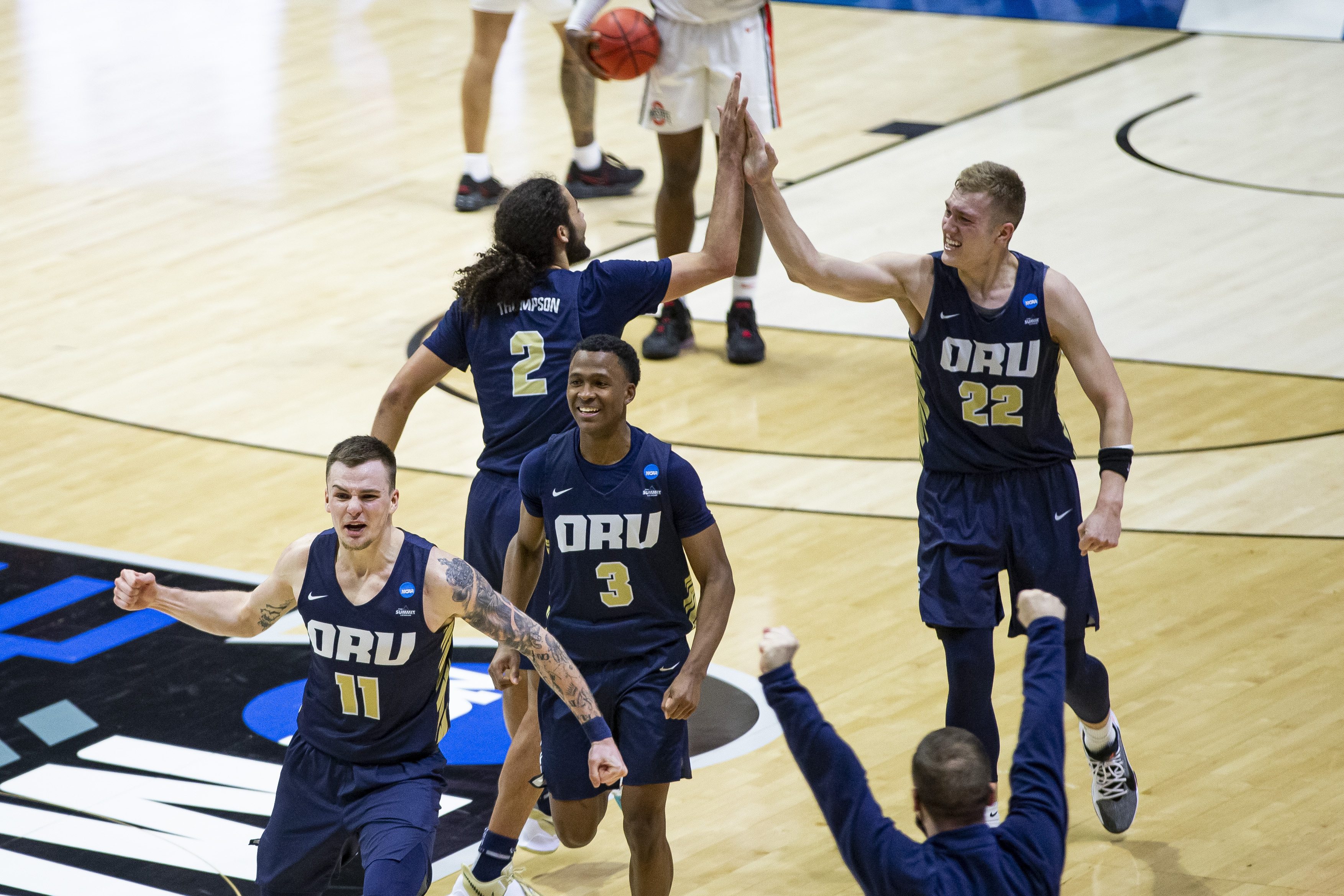 Oral Roberts players celebrate after beating Ohio State in a first-round game in the NCAA men’s college basketball tournament, Friday, March 19, 2021, at Mackey Arena in West Lafayette, Ind. (AP Photo/Robert Franklin)