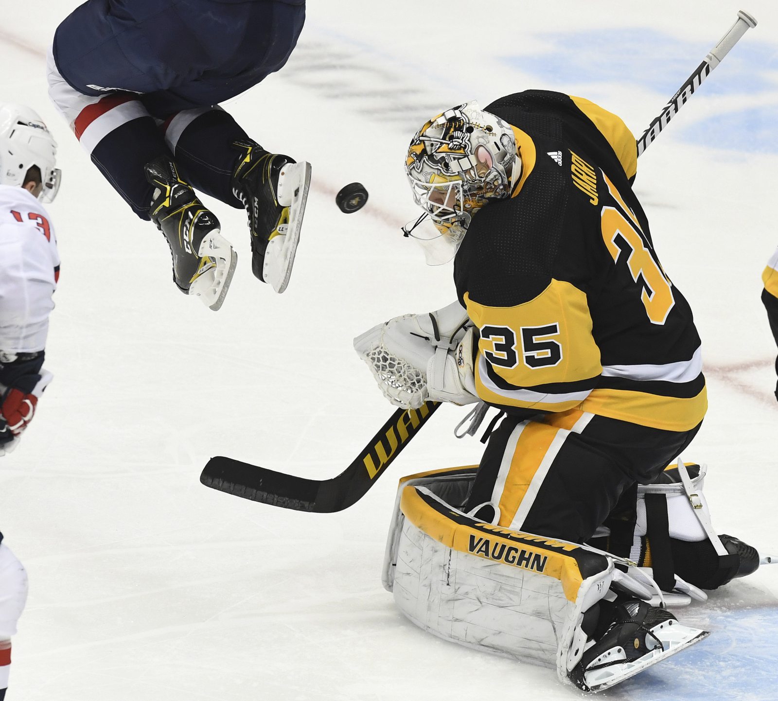 The Penguins goaltender Tristan Jarry makes a save agains the Capitals in the second period on Sunday, Feb. 14, 2021 at PPG Paints Arena.