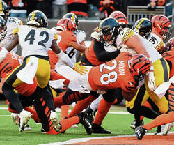 Line Judge Gary Arthur tries to get Steelers head coach Mike Tomlin off the field in the fourth quarter during the Browns game Sunday, Dec. 01, 2019 at Heinz Field.